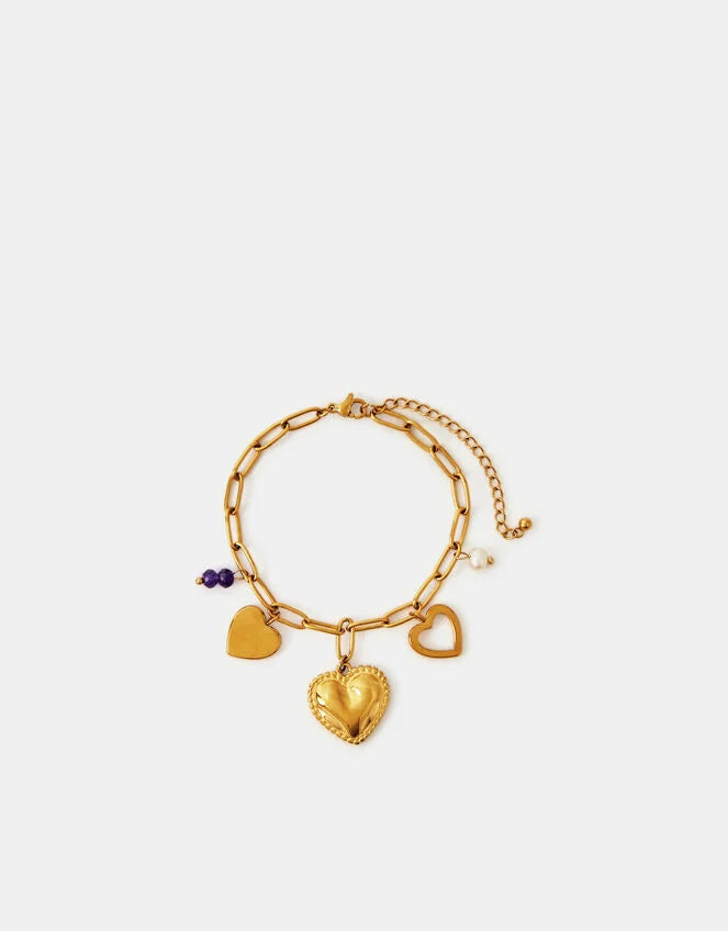 Crafted in durable stainless steel, this bracelet showcases heart charms, glass beads and pearl embellishments. Fastens with a lobster clasp and extender.