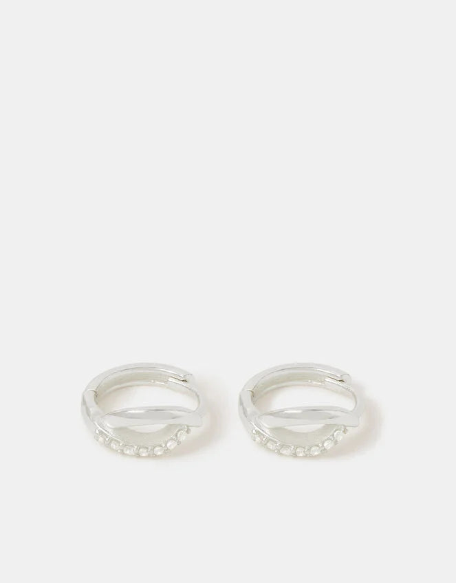 An everyday essential, but elevated. Designed in solid 925 sterling silver, these mini hoop earrings feature a unique twist design with sparkly diamantés to finish.