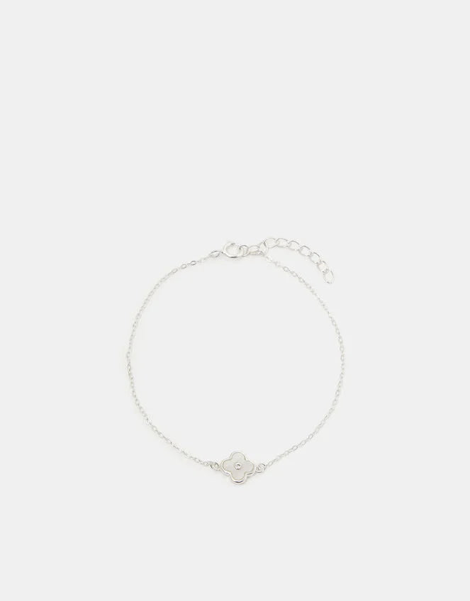 The mother of all lucky charms, this bracelet is a must for your wrist stack. Crafted in 925 sterling silver, it showcase a four leaf clover with mother of pearl and a dainty diamanté at the centre.